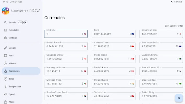 Umechoshwa na usumbufu wa kubadilisha vitengo mbalimbali vya vipimo? Converter NOW inakuja kurahisisha maisha yako! Fikiria uwezo wa kubadilisha kipimo chochote papo hapo, kwa kasi ya ajabu, mara tu unapoanza kuandika. Hakuna tena kusubiri au kubofya mara nyingi; majibu yako unayapata kwa wakati halisi. Kuanzia sarafu hadi urefu, uzito hadi joto, Converter NOW inashughulikia zaidi ya vitengo 200+ vya vipimo na sarafu 30+ tofauti, ikikupa uhakika wa usahihi na ufanisi usio na kifani.